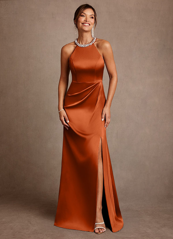 Burnt Orange A-Line Pleated Stretch Satin Dress