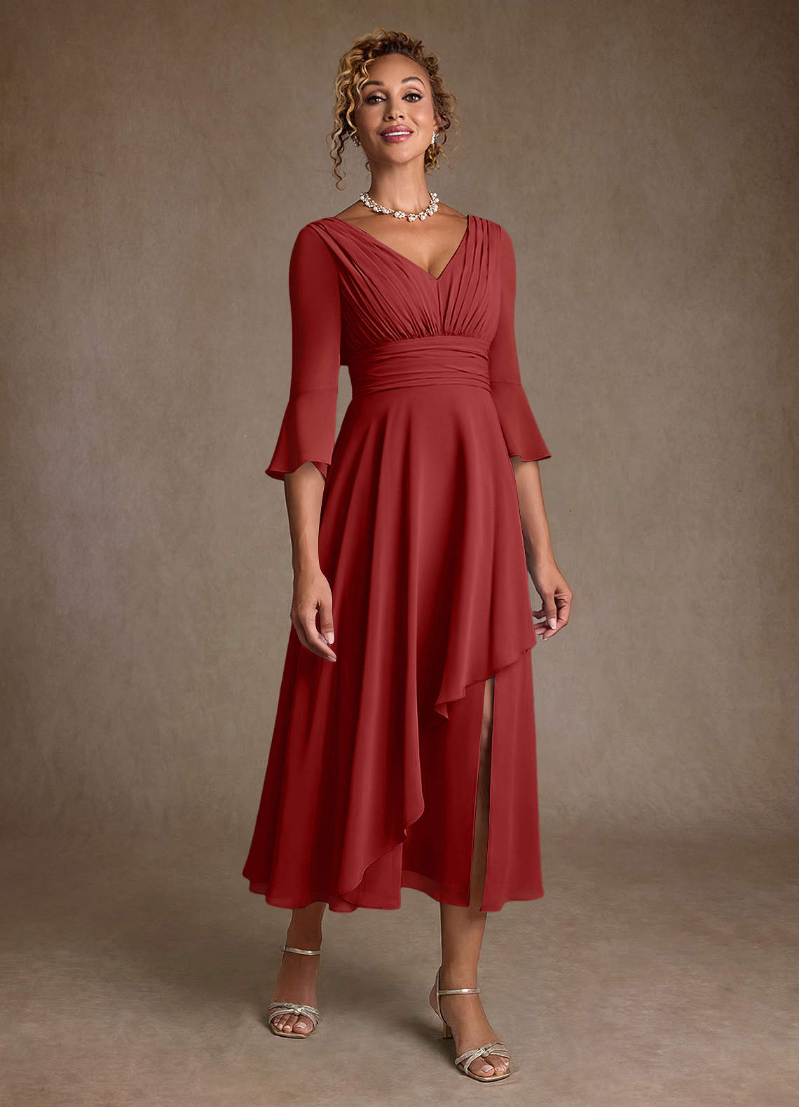 Rust A-Line Pleated Chiffon Dress