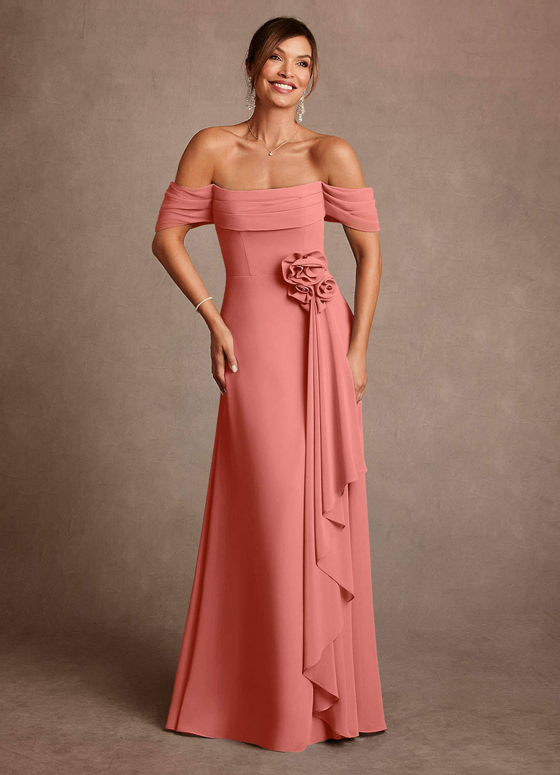 Salmon Pink A-Line Off the Shoulder Chiffon Dress