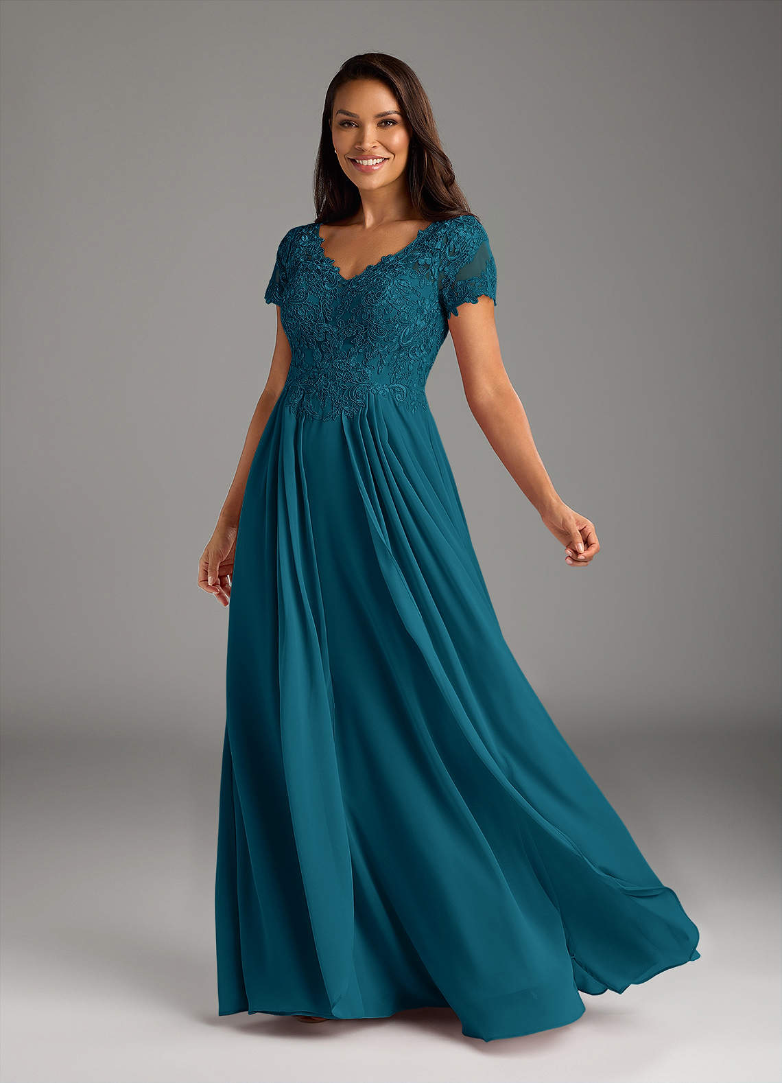 Ink Blue A-Line V-Neck Lace Chiffon Dress