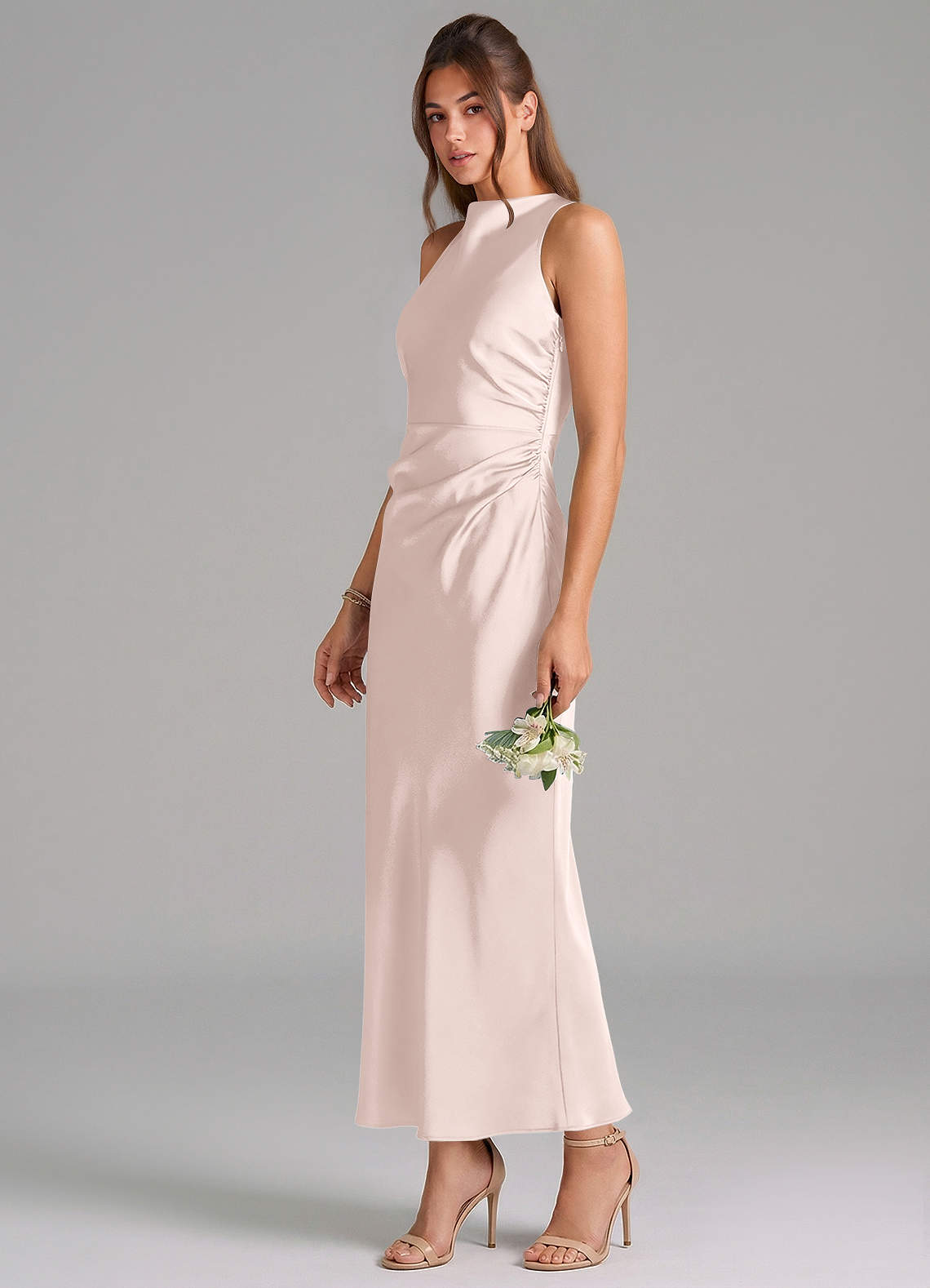 Blushing Pink Sheath Pleated Stretch Satin Dress