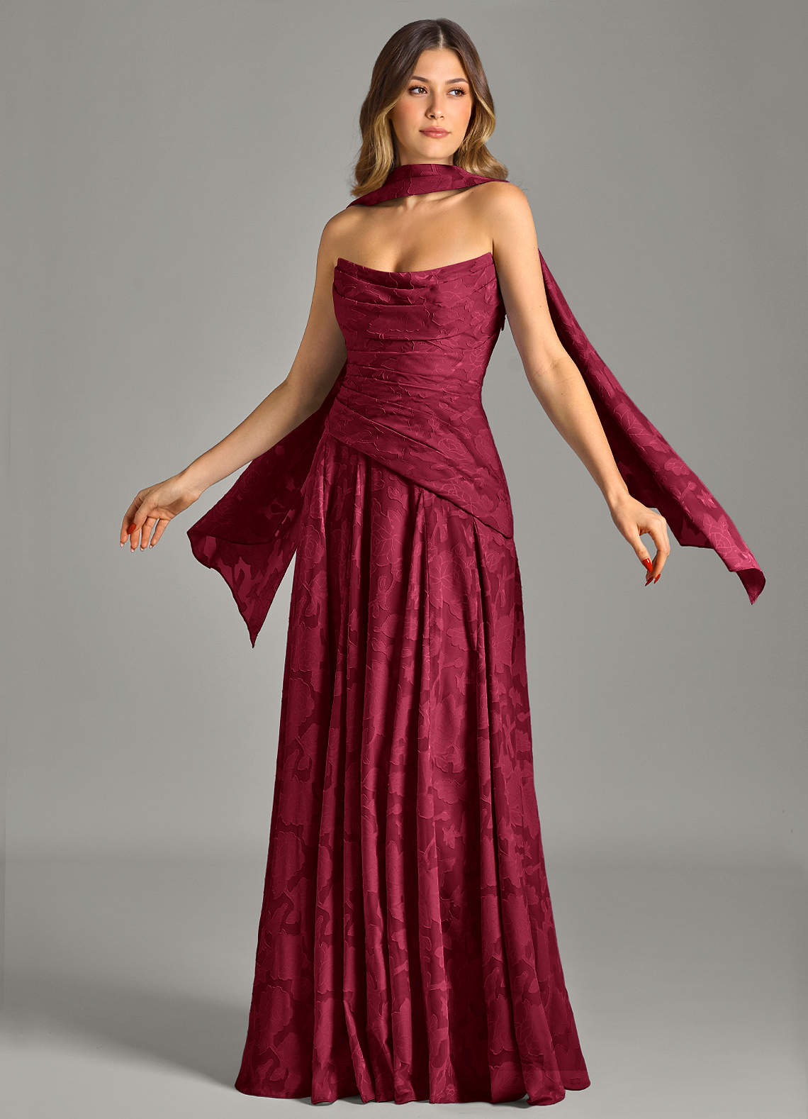 Burgundy A-Line Strapless Floral Burnout Dress