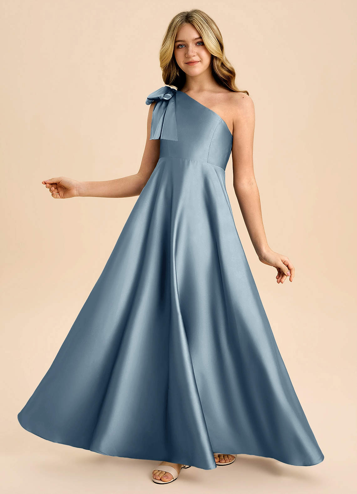 Dusty Blue A-Line Bow Stretch Satin Dress