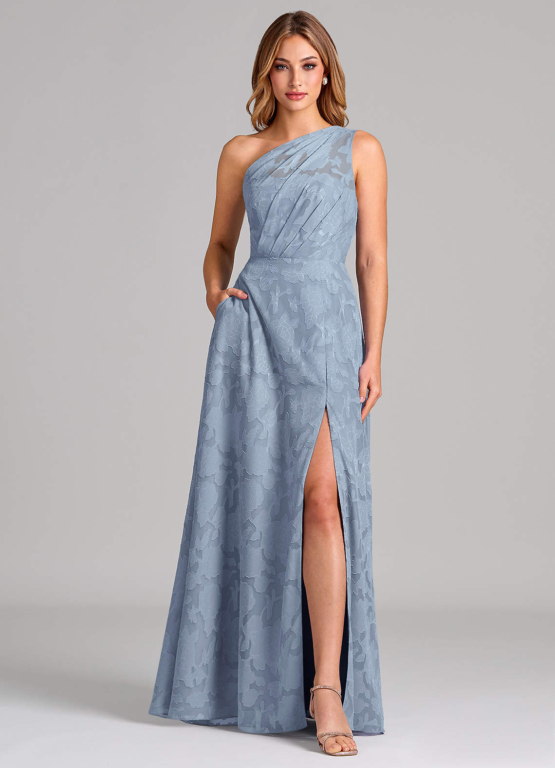 Dusty Blue A-Line One Shoulder Floral Burnout Dress