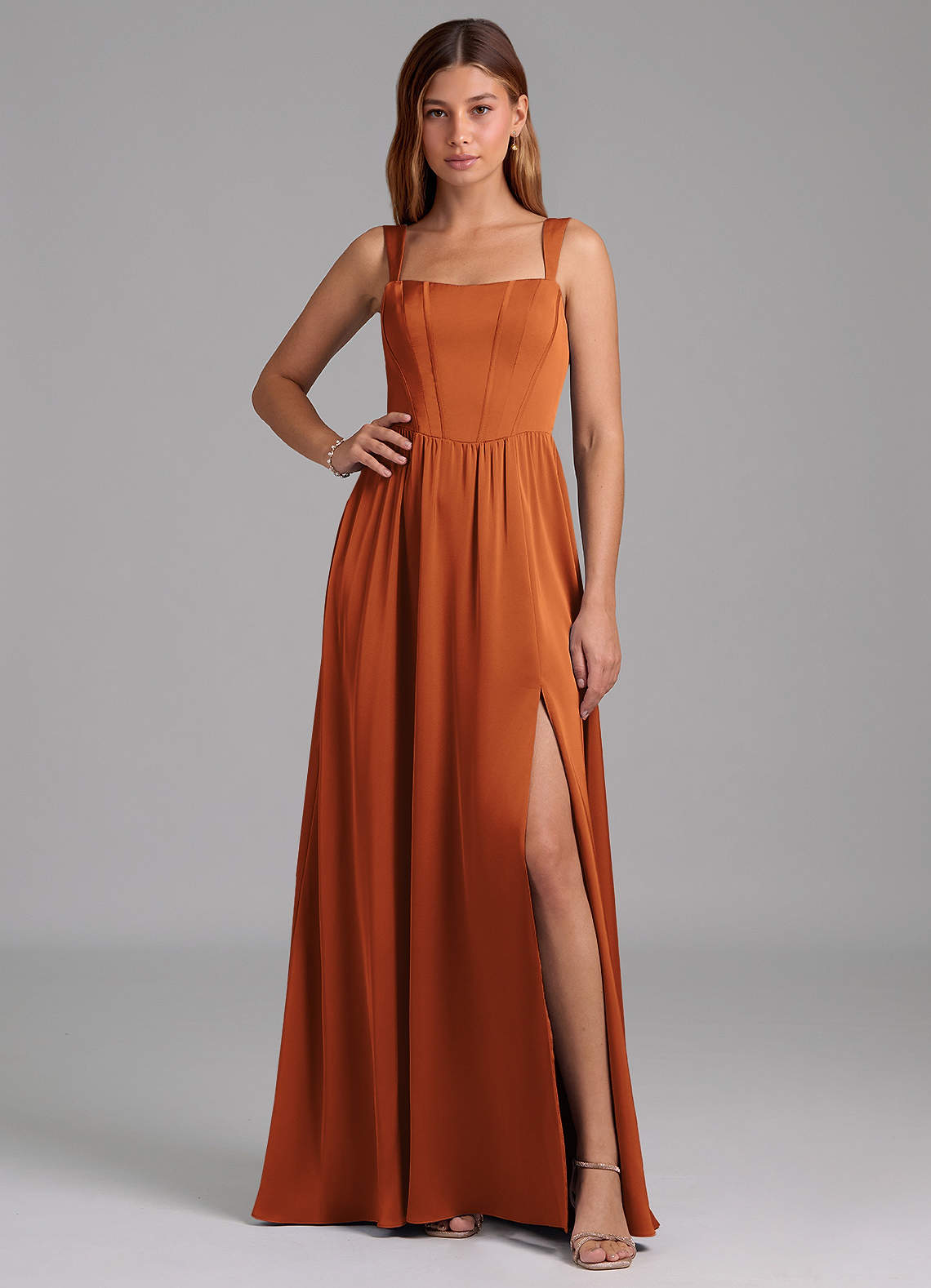 Cinnamon A-Line Side Slit Stretch Satin Dress
