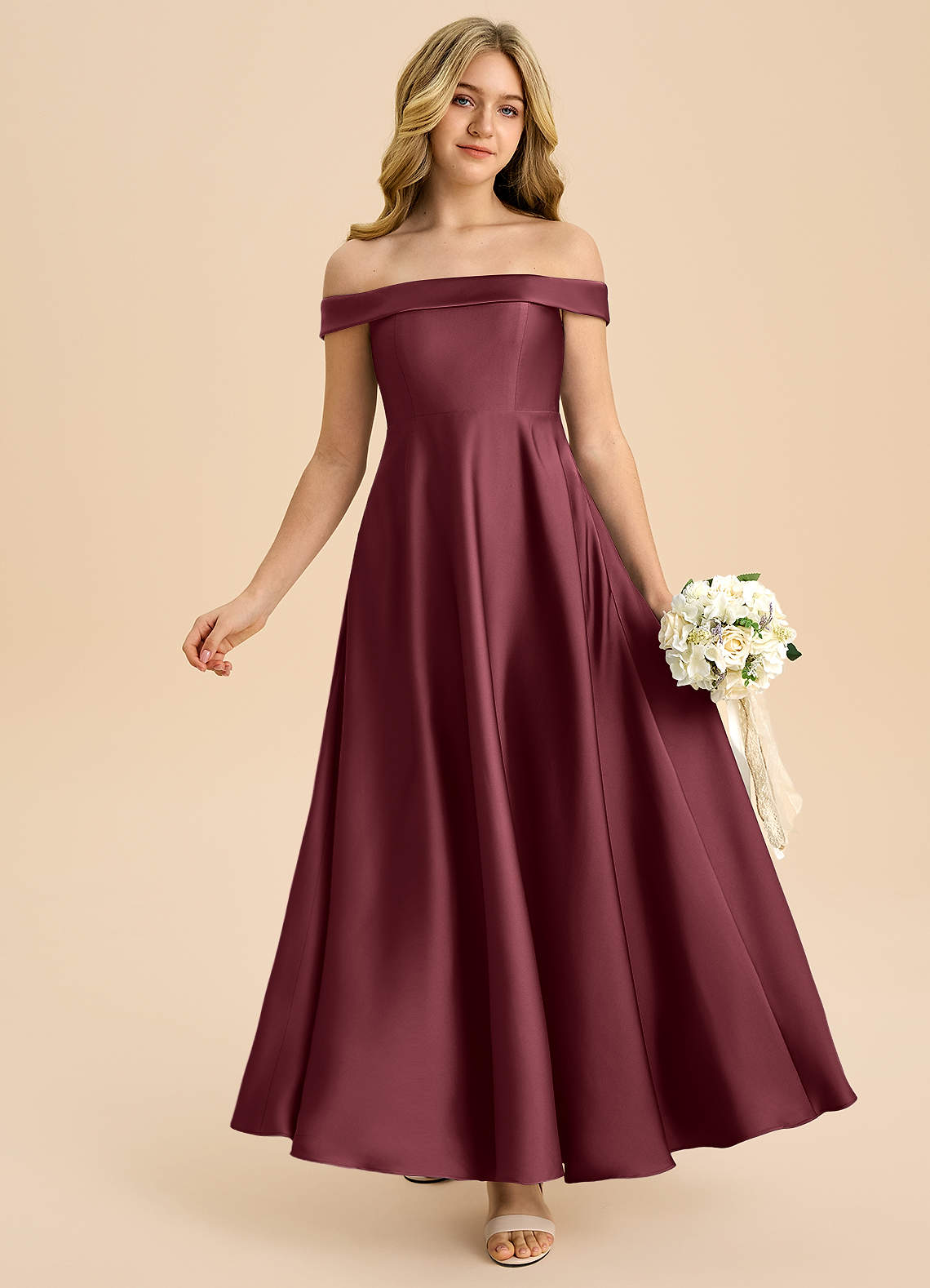Merlot A-Line Off the Shoulder Stretch Satin Dress