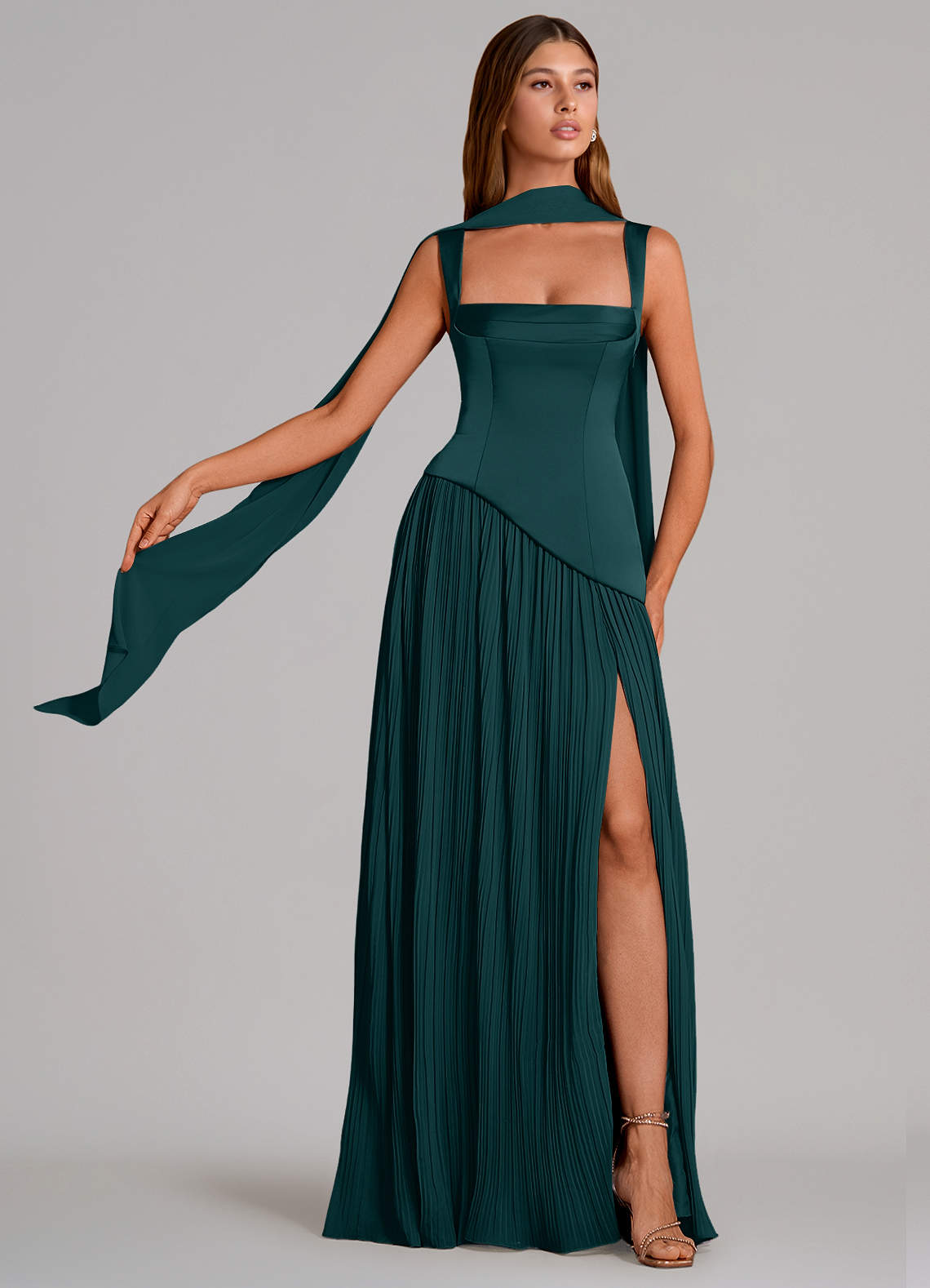 Pine A-Line Pleated Stretch Satin Dress