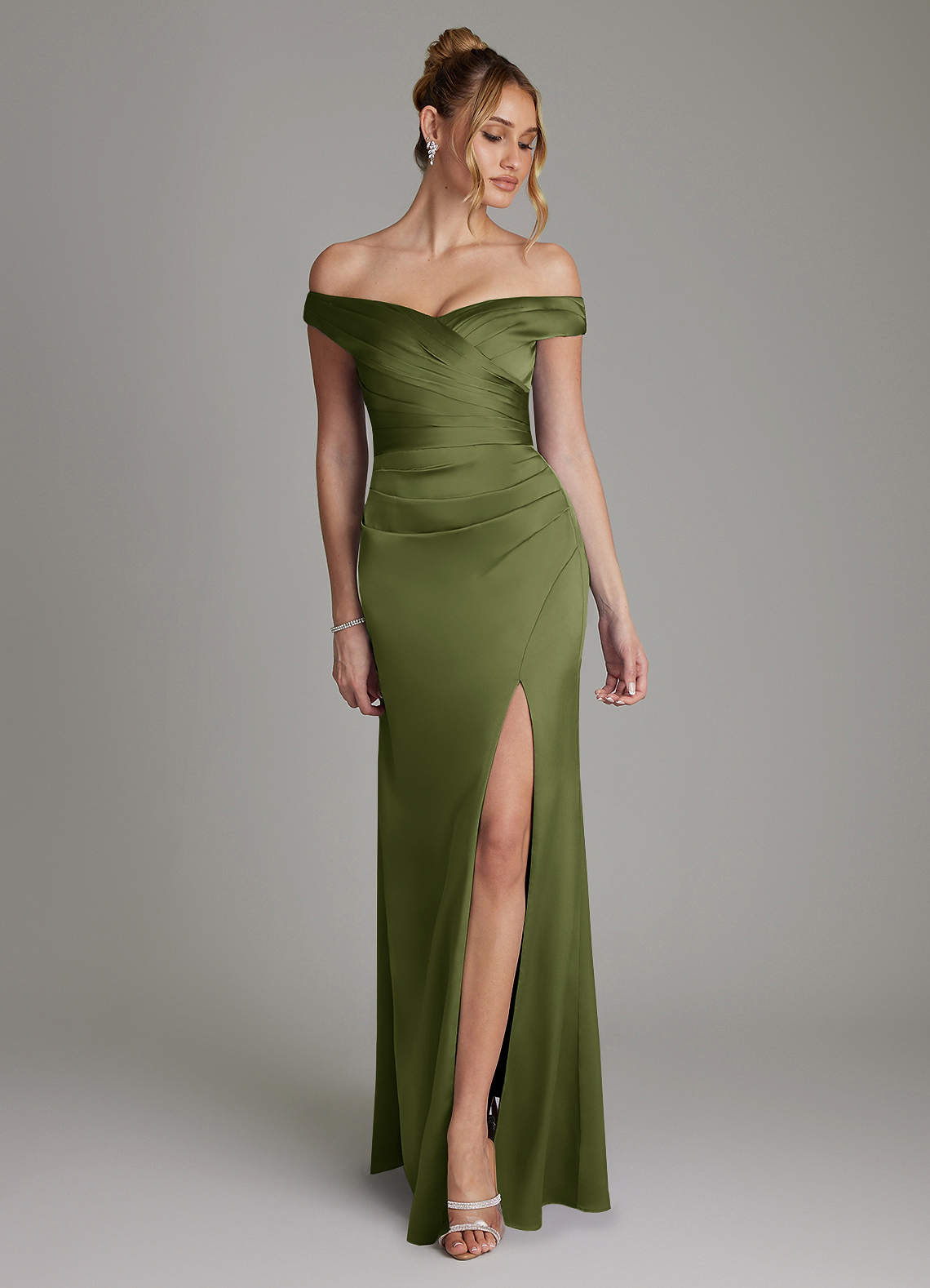 Olive Sheath Off the Shoulder Stretch Satin Dress