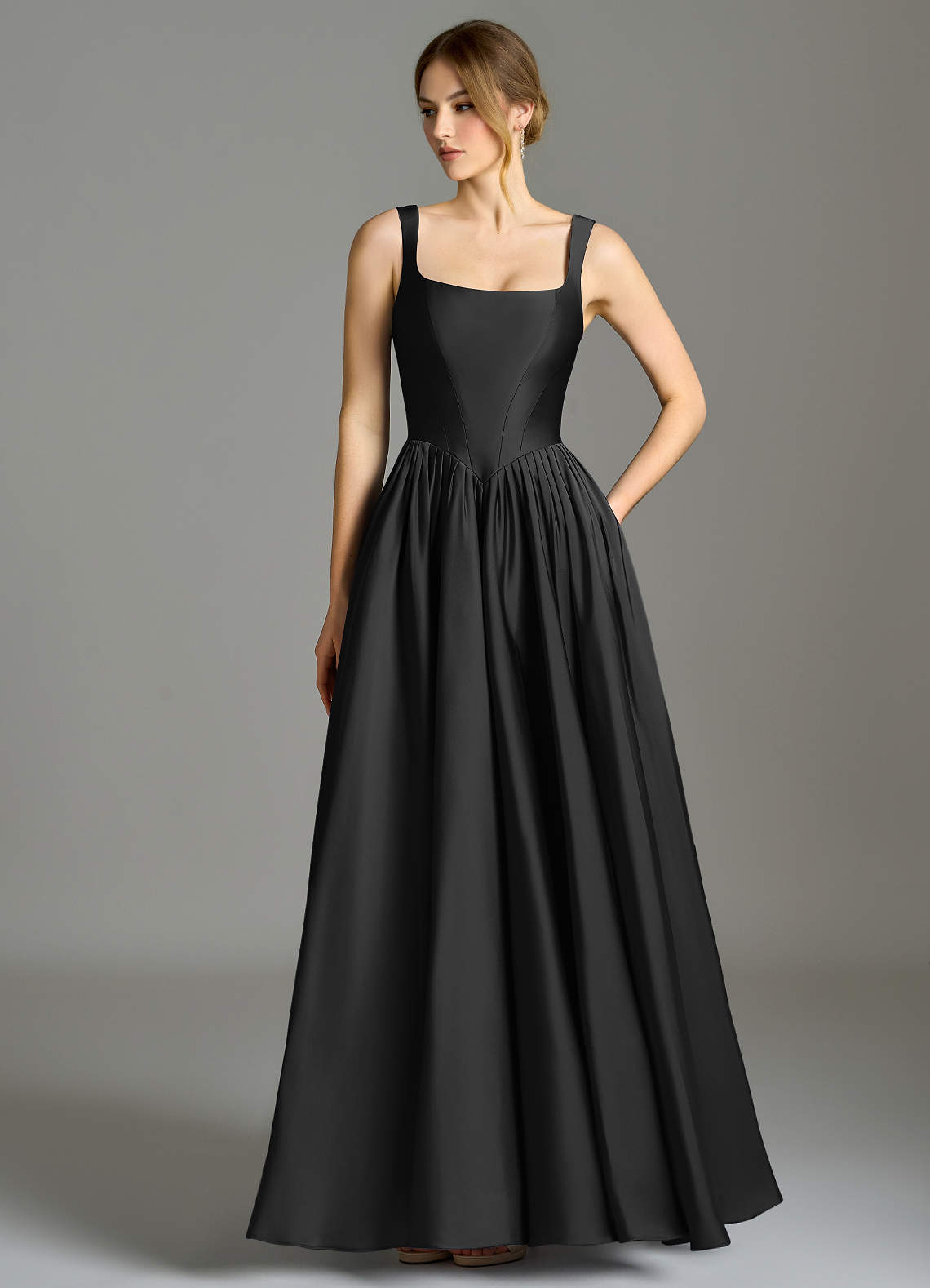 Black A-Line Pleated Stretch Satin Dress