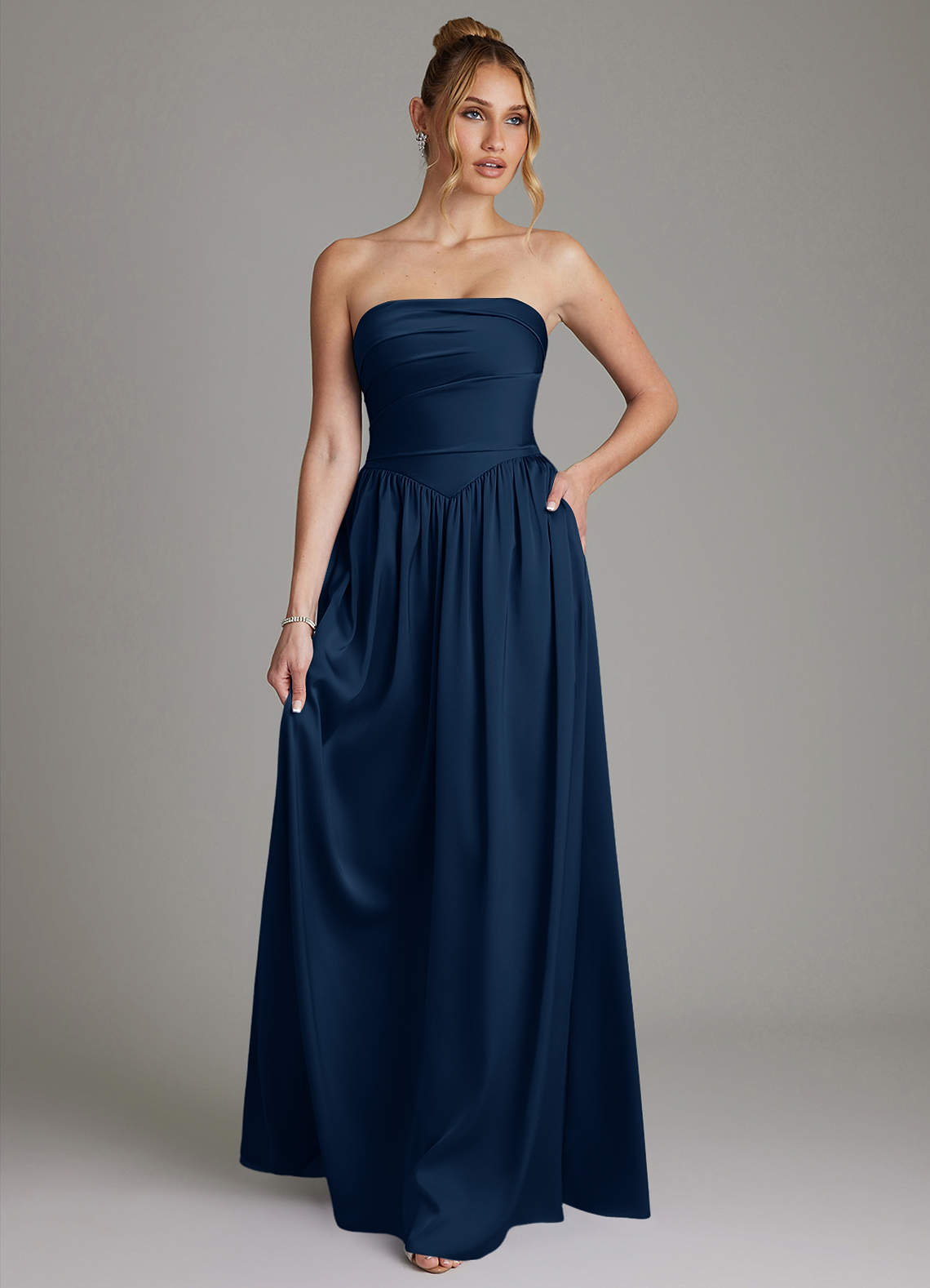 Dark Navy A-Line Strapless Stretch Satin Dress
