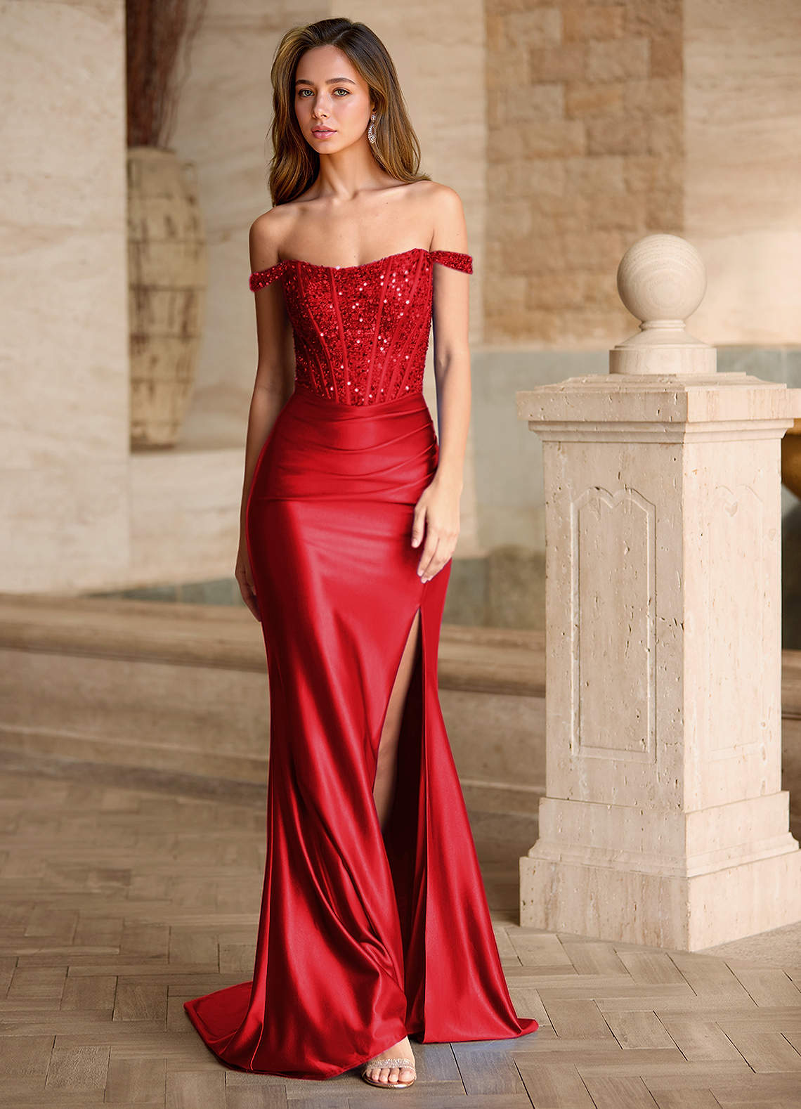 Valeria Red Velvet Sequins Corset Satin Prom Dress