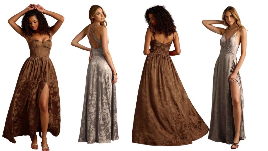 This gorgeous jacquard maxi now comes in dazzling shades of ‘Platinum’ and ‘Coco’ in addition to ‘Rust’. Its sweetheart neckline and flutter sleeves add a romantic feel to this elegant dress. The dreamy fabric moves with you with every twist and twirl on the dance floor. Shop Now