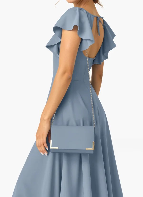Match jewelry metal tones across all bridesmaids. Individual clutch colors can vary but should stay in the same family (all metallics or all neutrals).