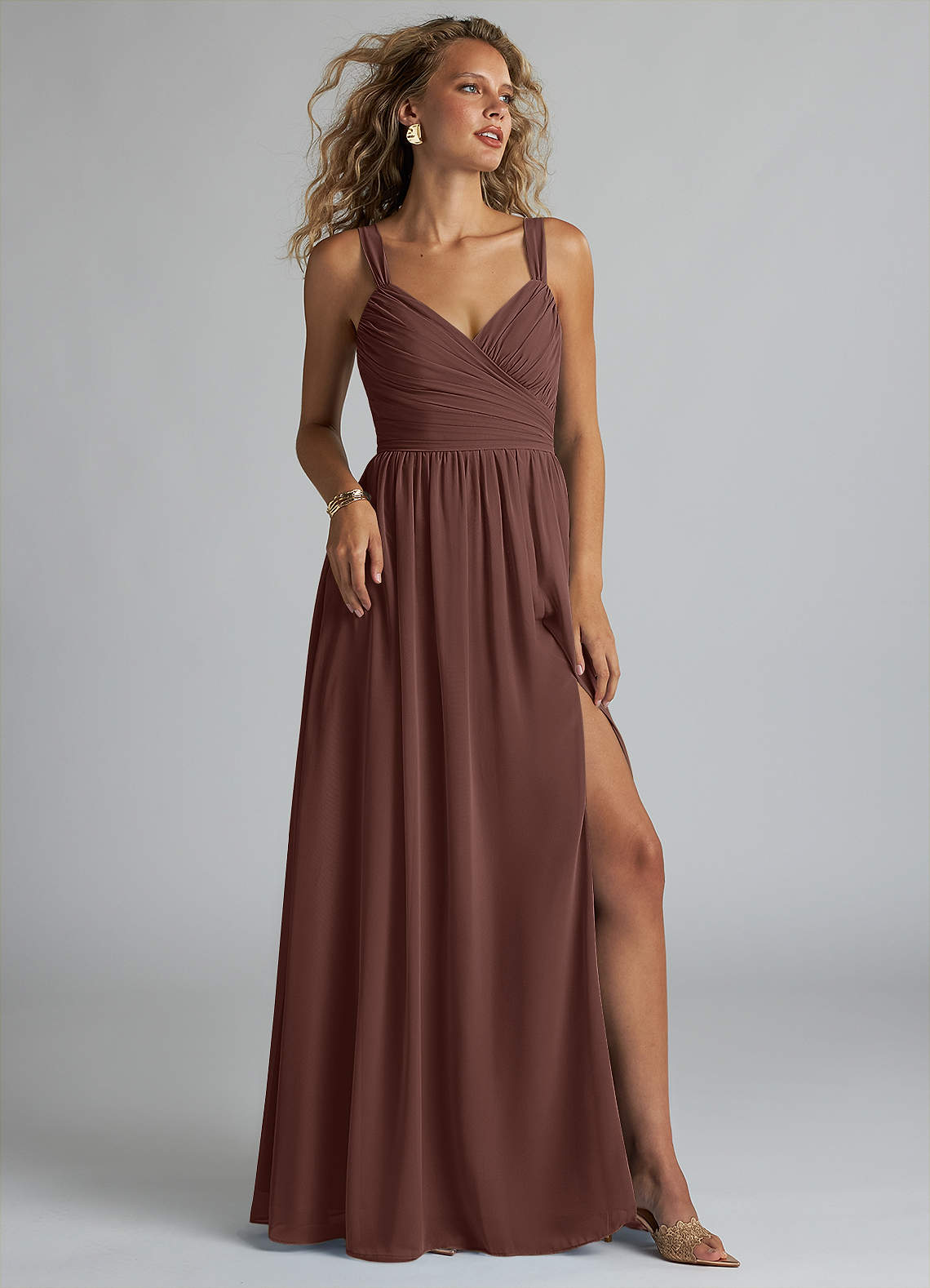 A-Linie V-Hals Gefaltet Chiffon Kleid Espresso