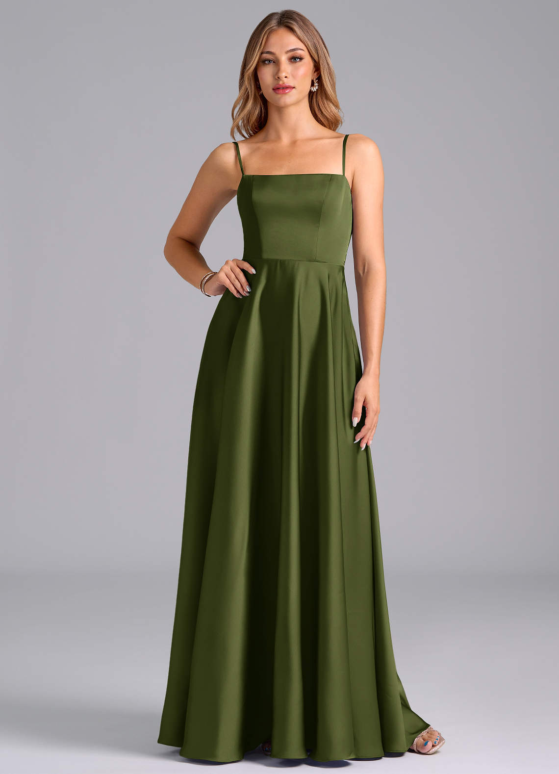 A-Linie Plissee Stretch-Satin Kleid Olivgrün
