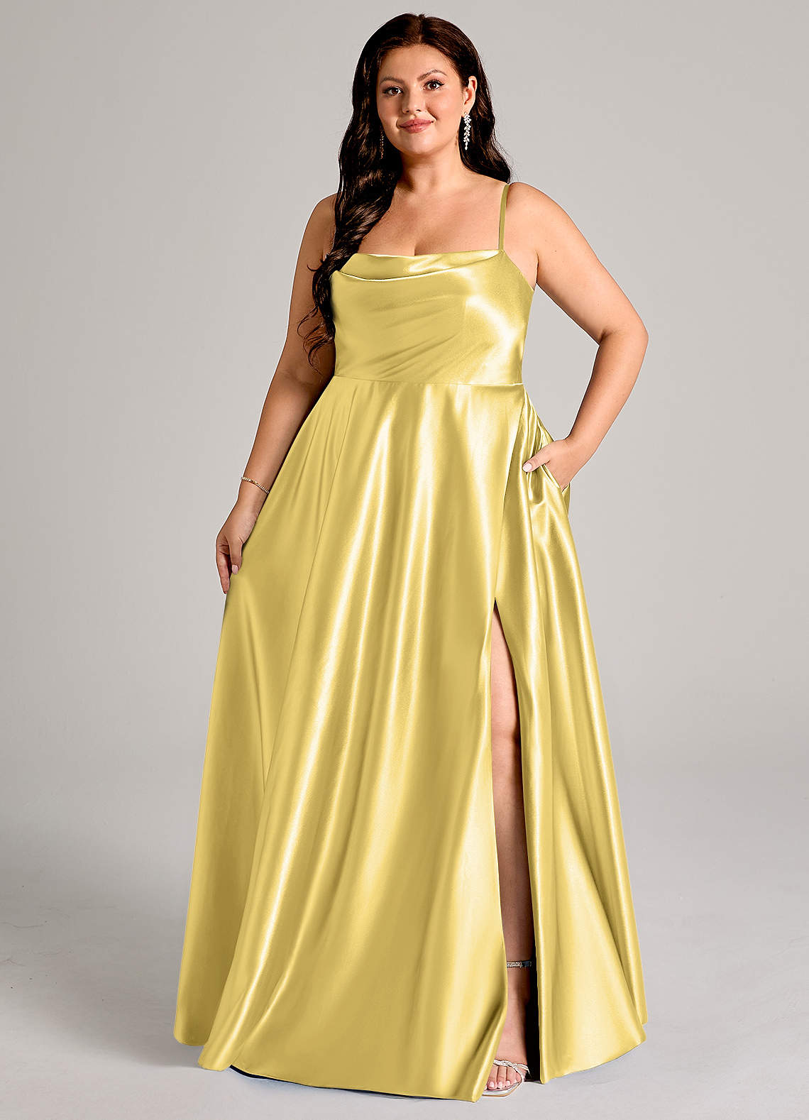 A-Linie mit Taschen Metallischer Satin Kleid Kanarienvogel