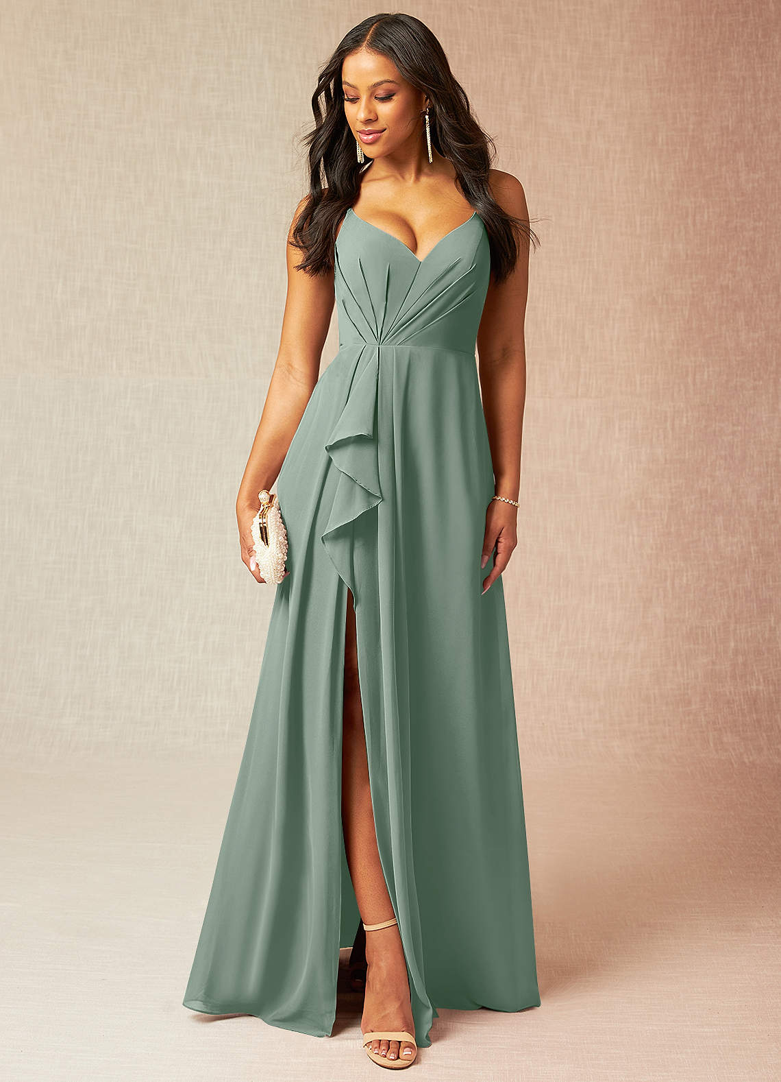 A-Linie V-Hals Gefaltet Chiffon Kleid Silberner Salbei