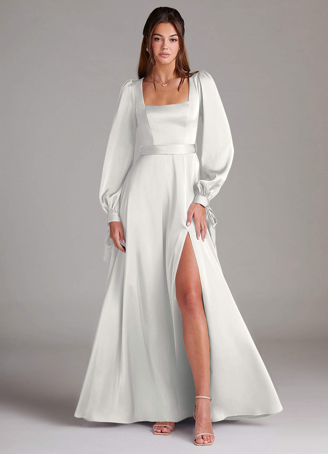 A-Linie Langarm Stretch-Satin Kleid Weiß