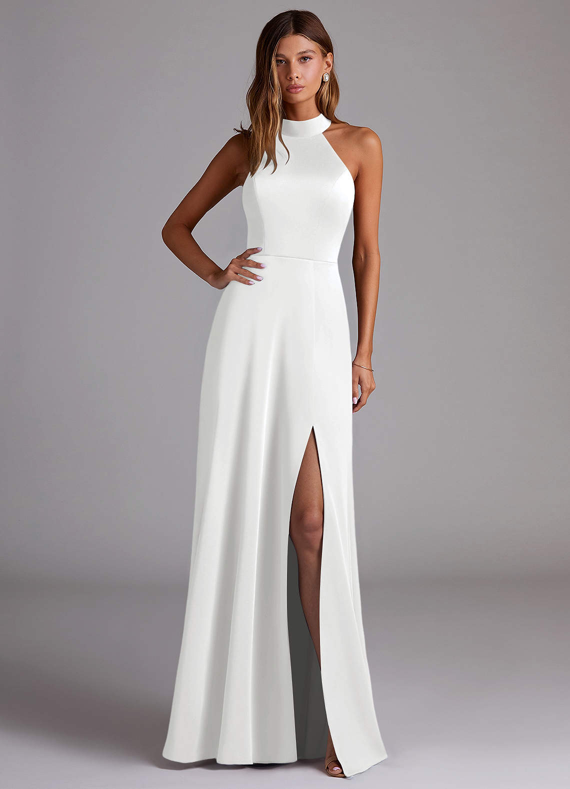A-Linie Hoher Kragen Stretch-Satin Kleid Weiß
