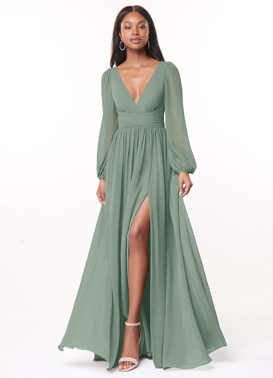 A-Linie Lange Ärmel mit V-Ausschnitt Chiffon Kleid Silberner Salbei