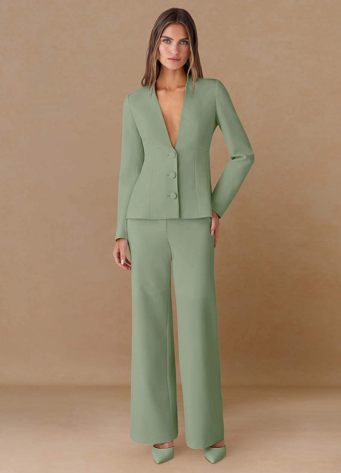 Elara Staubiger Salbeigrün Zweiteiliger Anzug aus hochwertigem, extrem tief ausgeschnittenem Material