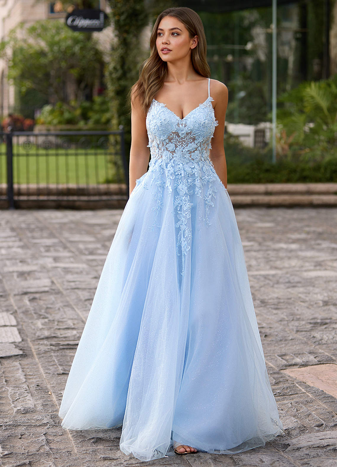 Filigreelace Himmelblau Ballkleid mit 3D-Blumenmuster