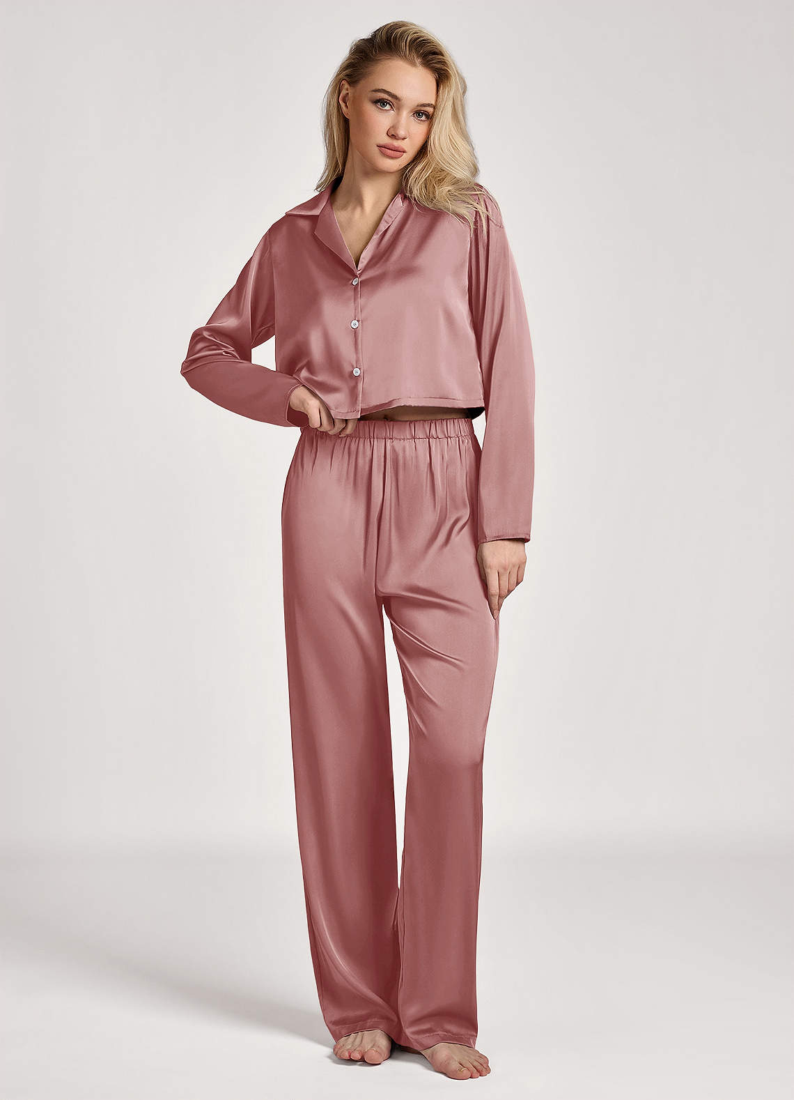 Pyjama-Set mit Satinkragen und langen Ärmeln
