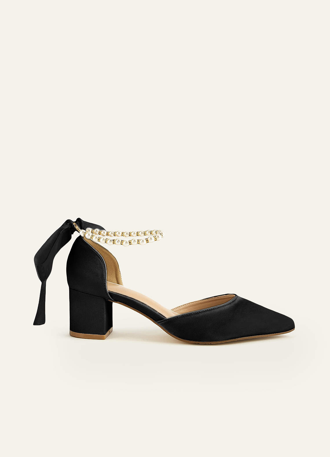 Satin-Pumps mit spitzer Spitze und Blockabsatz, Perlen und Schleife