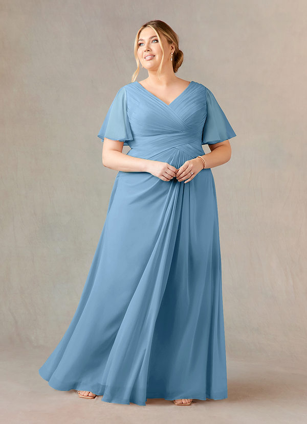 Steel Blue A-Line V-Neck Pleated Chiffon Dress