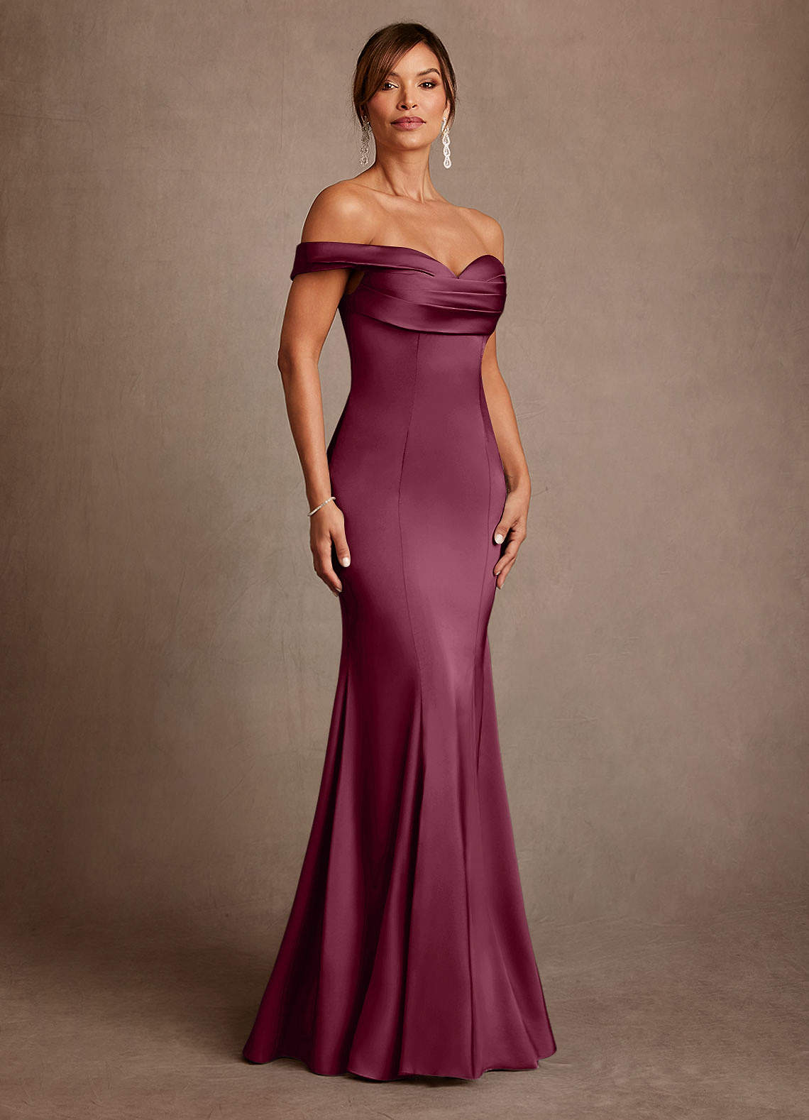 Mulberry Mermaid Off the Shoulder Stretch Satin Dress