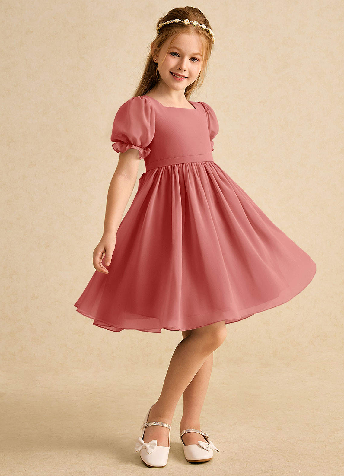 Antique Rose A-Line with Sleeves Chiffon Dress