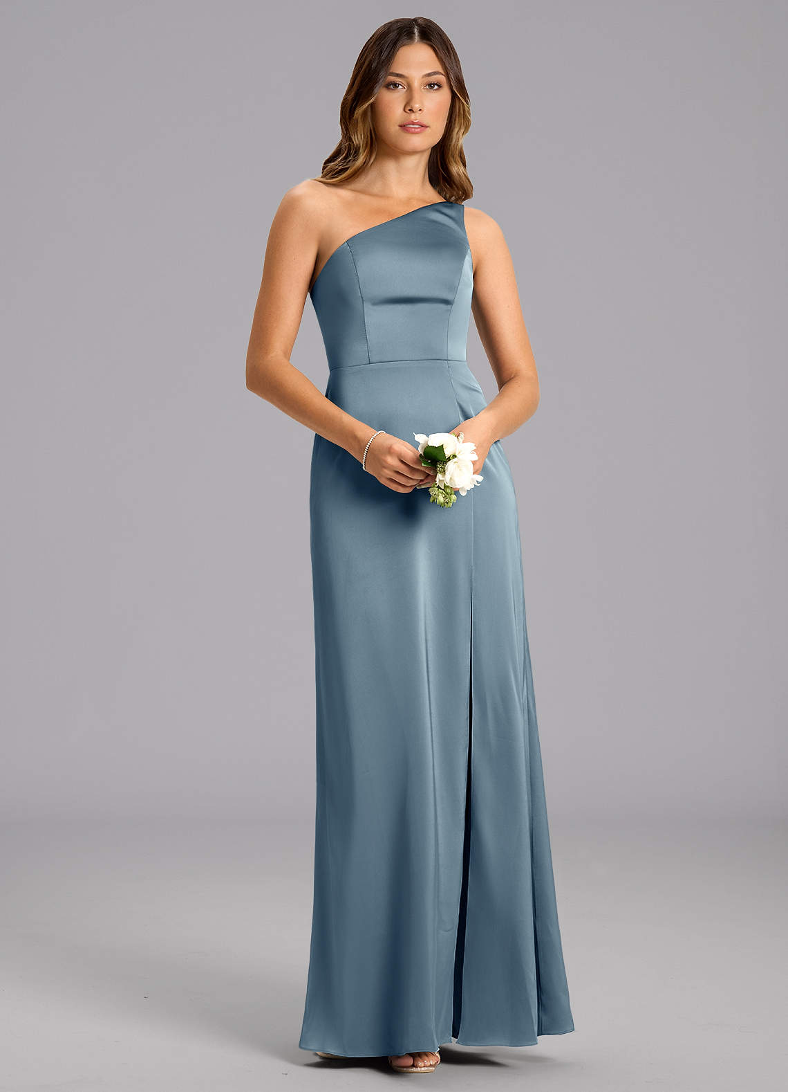 Dusty Blue A-Line One Shoulder Stretch Satin Dress