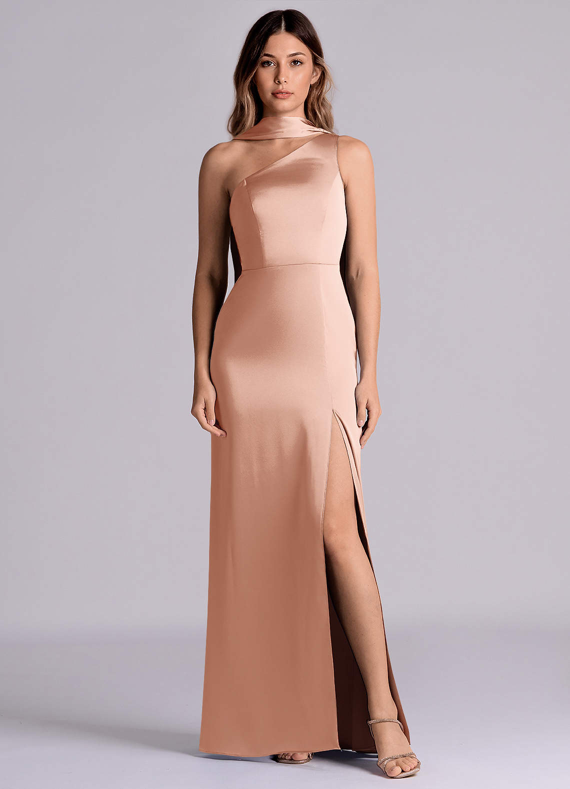Rose Gold A-Line One Shoulder Stretch Satin Dress