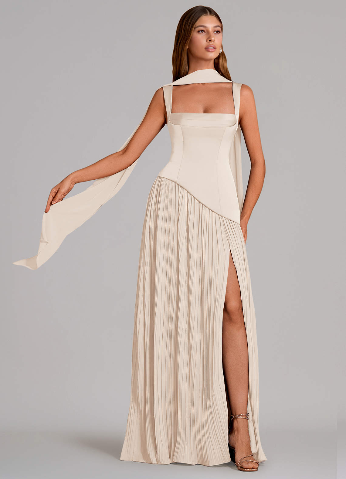 White Alabaster A-Line Pleated Stretch Satin Dress