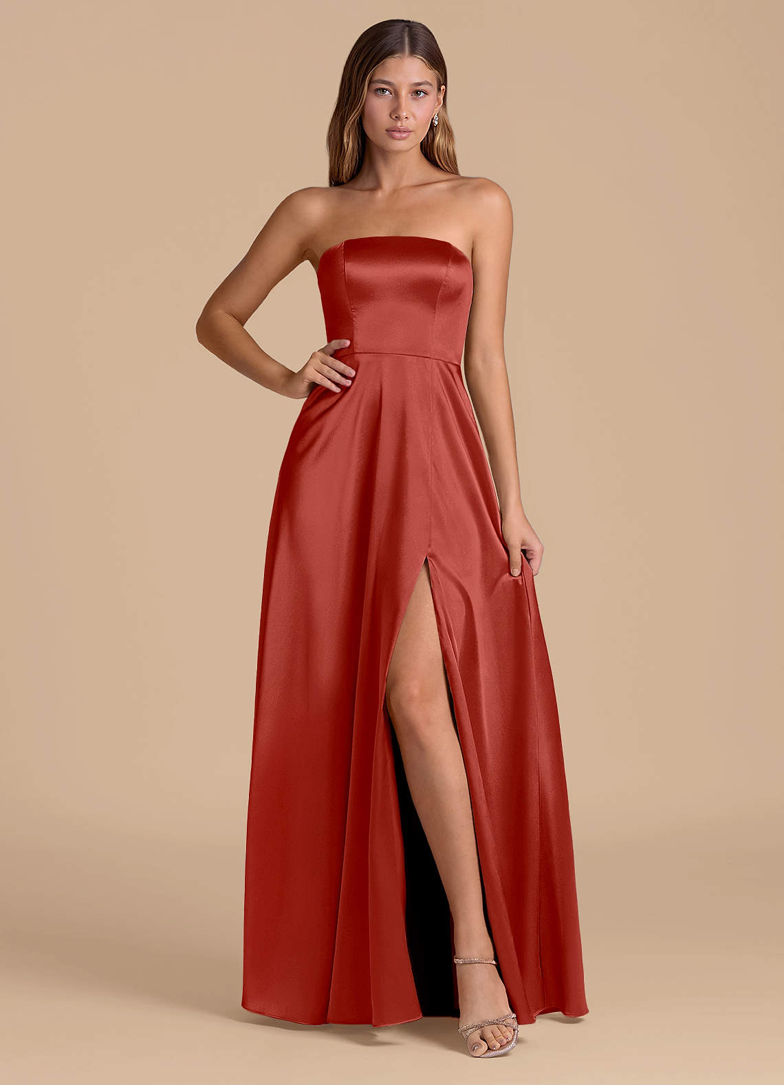 Rust A-Line Strapless Metallic Satin Dress