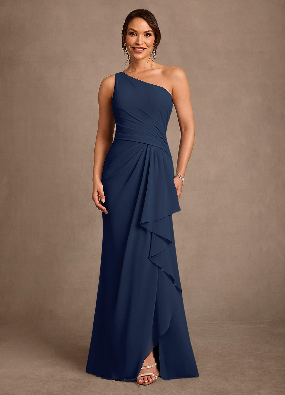 Vestido de Azul Marino Oscuro de Gasa de Corte Recto con Hombro unilateral