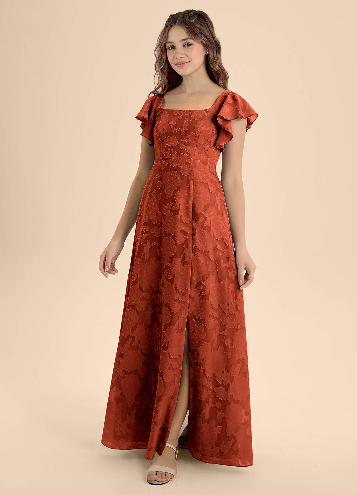 Vestido de Castaño de Devorado Floral de Corte en A con Lazo