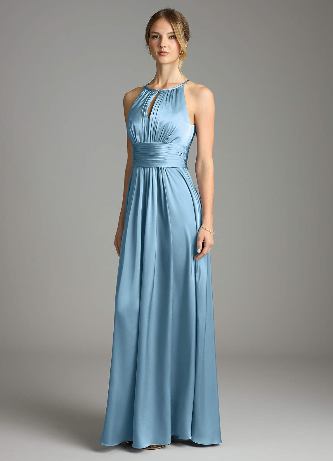 Vestido de Azul Acero de Satén Elástico de Corte en A con Plisado