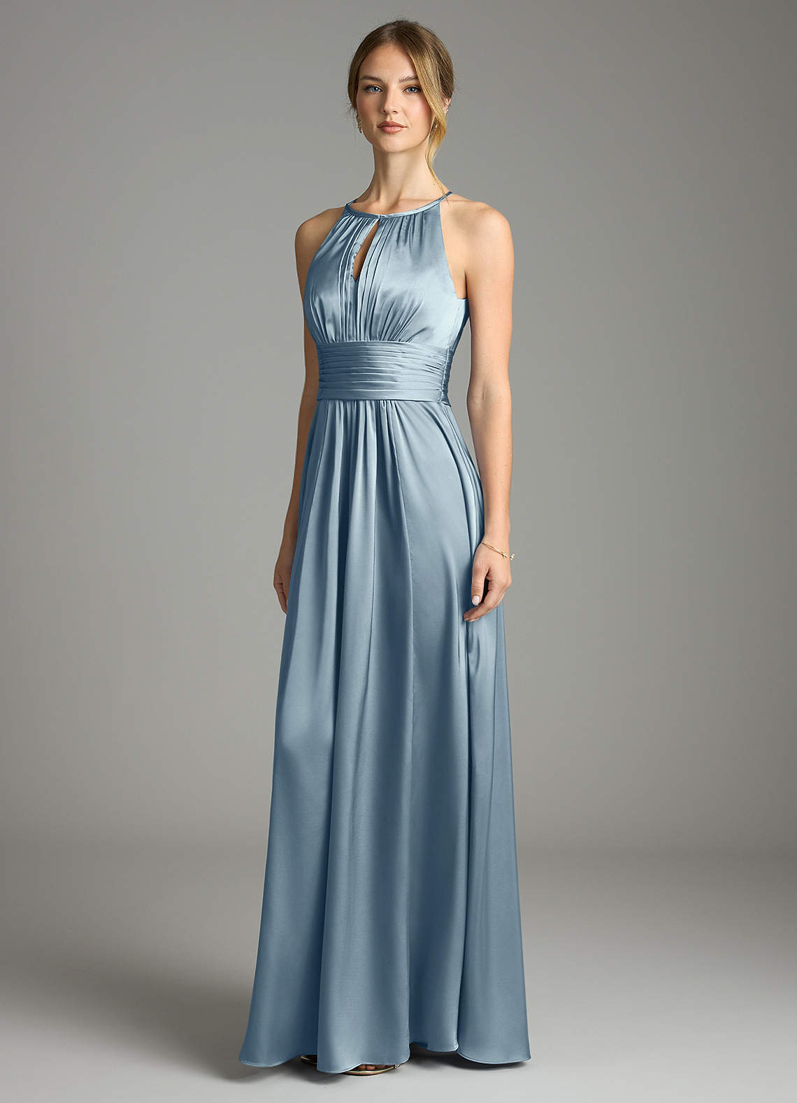 Vestido de Azul Polvoriento de Satén Elástico de Corte en A con Plisado