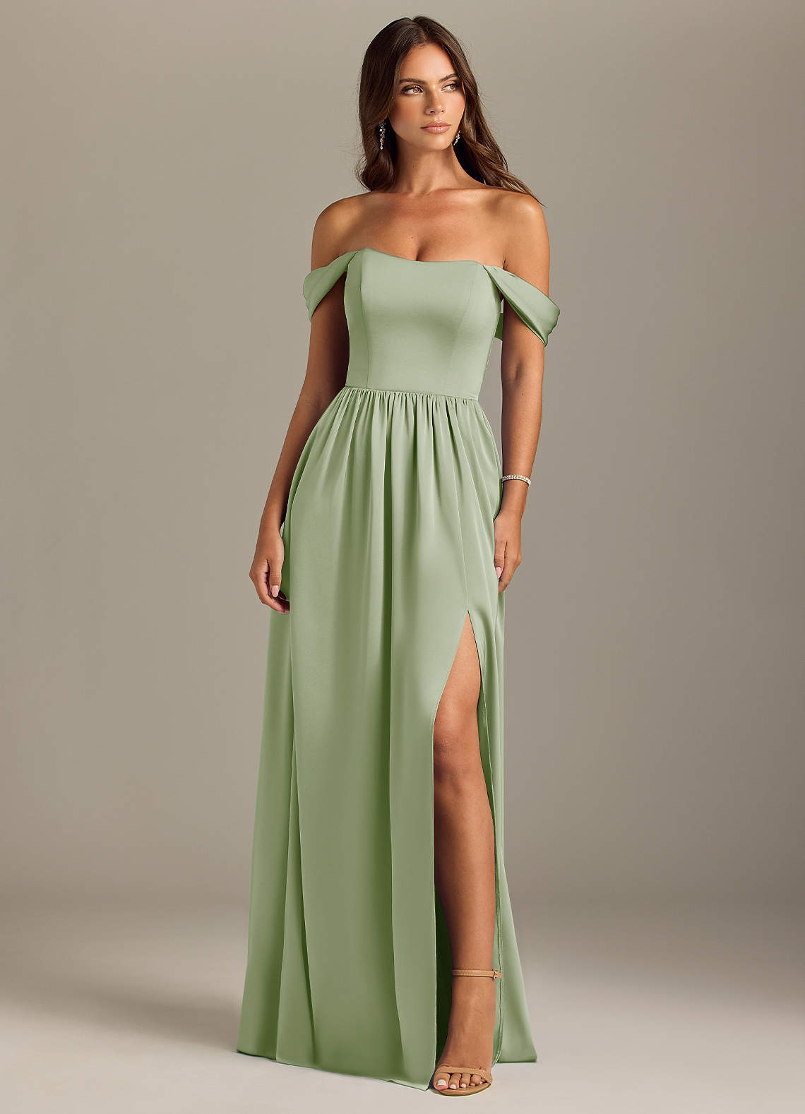 Vestido de Salvia Polvorienta de Satén Elástico de Corte en A Convertible con Vestidos sin tirantes