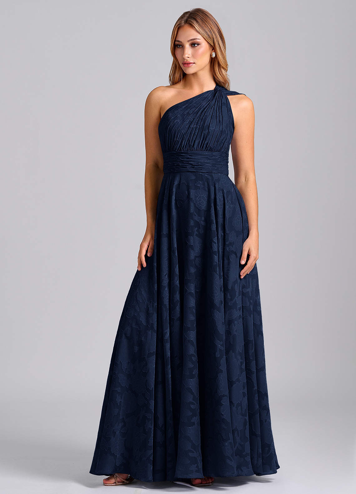 Vestido de Azul Marino Oscuro de Devorado Floral de Corte en A con Hombro unilateral