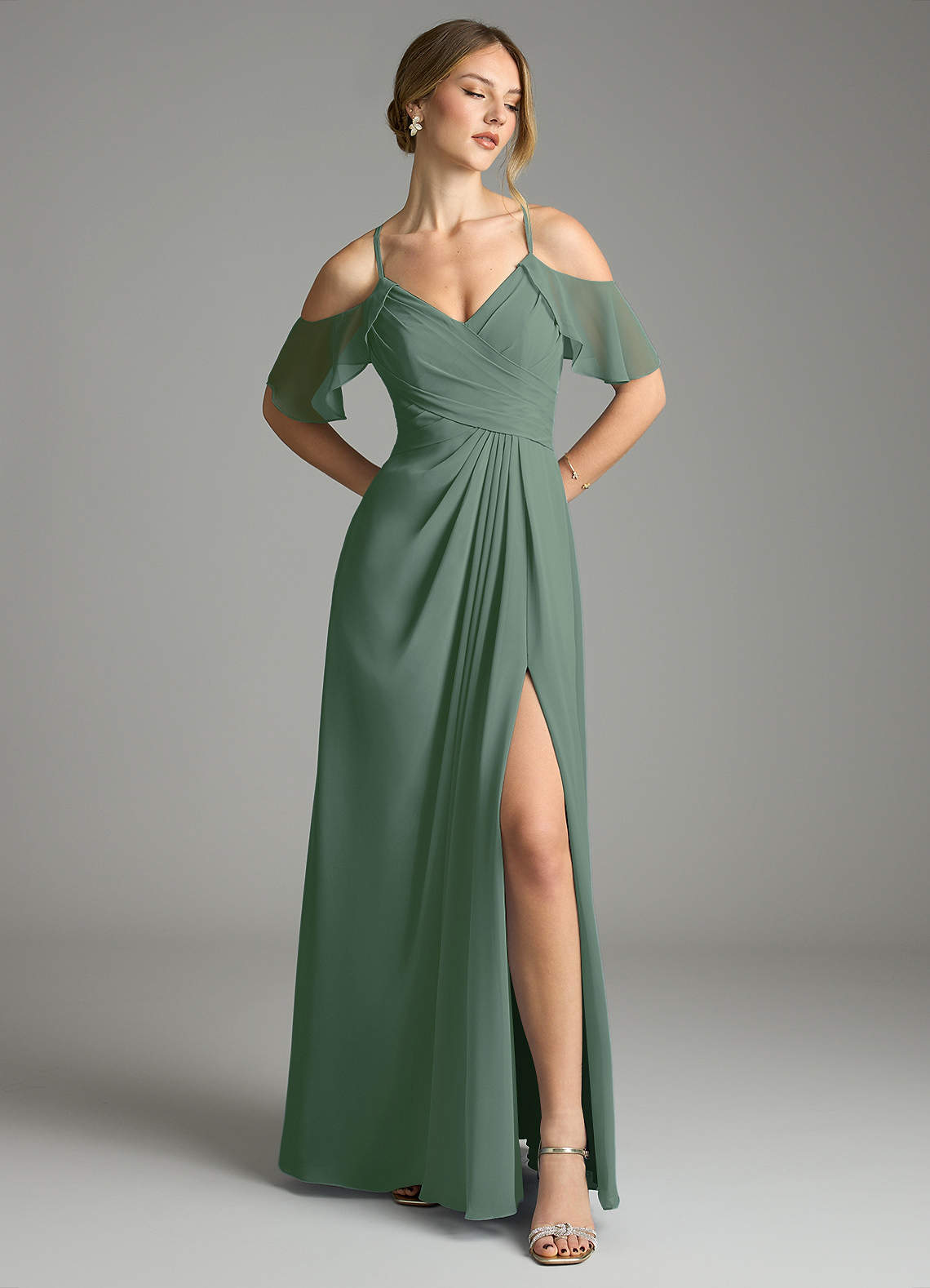 Vestido de Eucalipto de Gasa de Corte en A con Cuello en V plisado