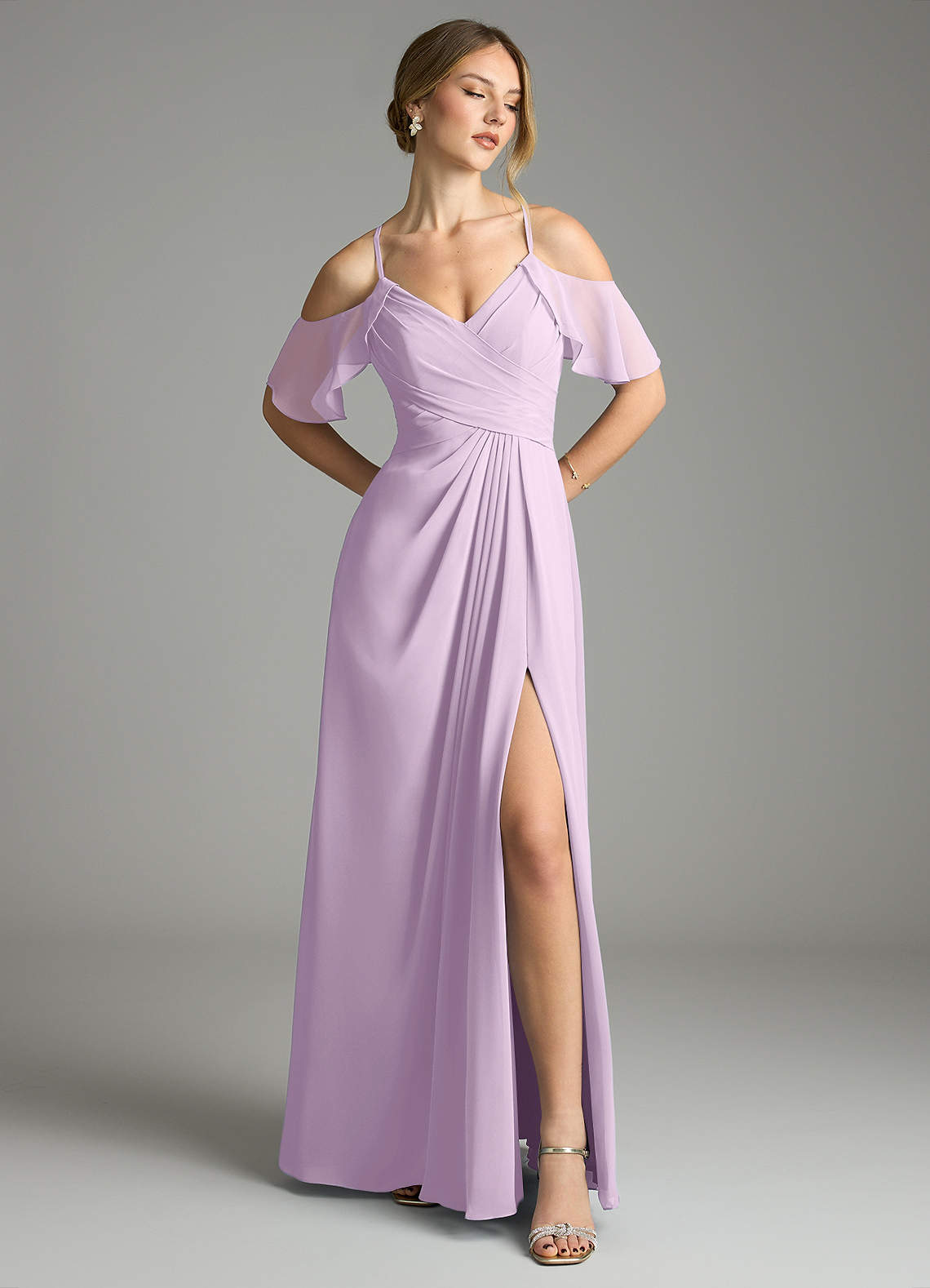 Vestido de Lila Esmerilada de Gasa de Corte en A con Cuello en V plisado