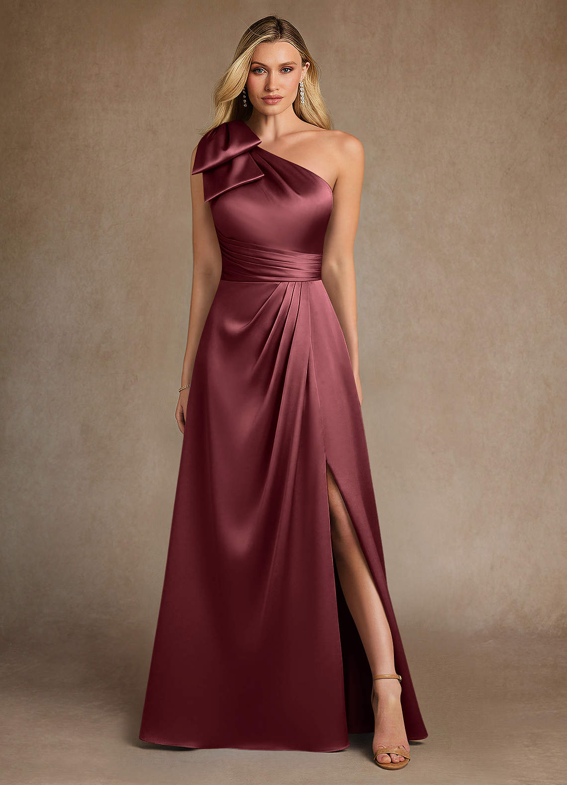 Vestido de Merlot de Satén Elástico de Corte en A con Hombro unilateral