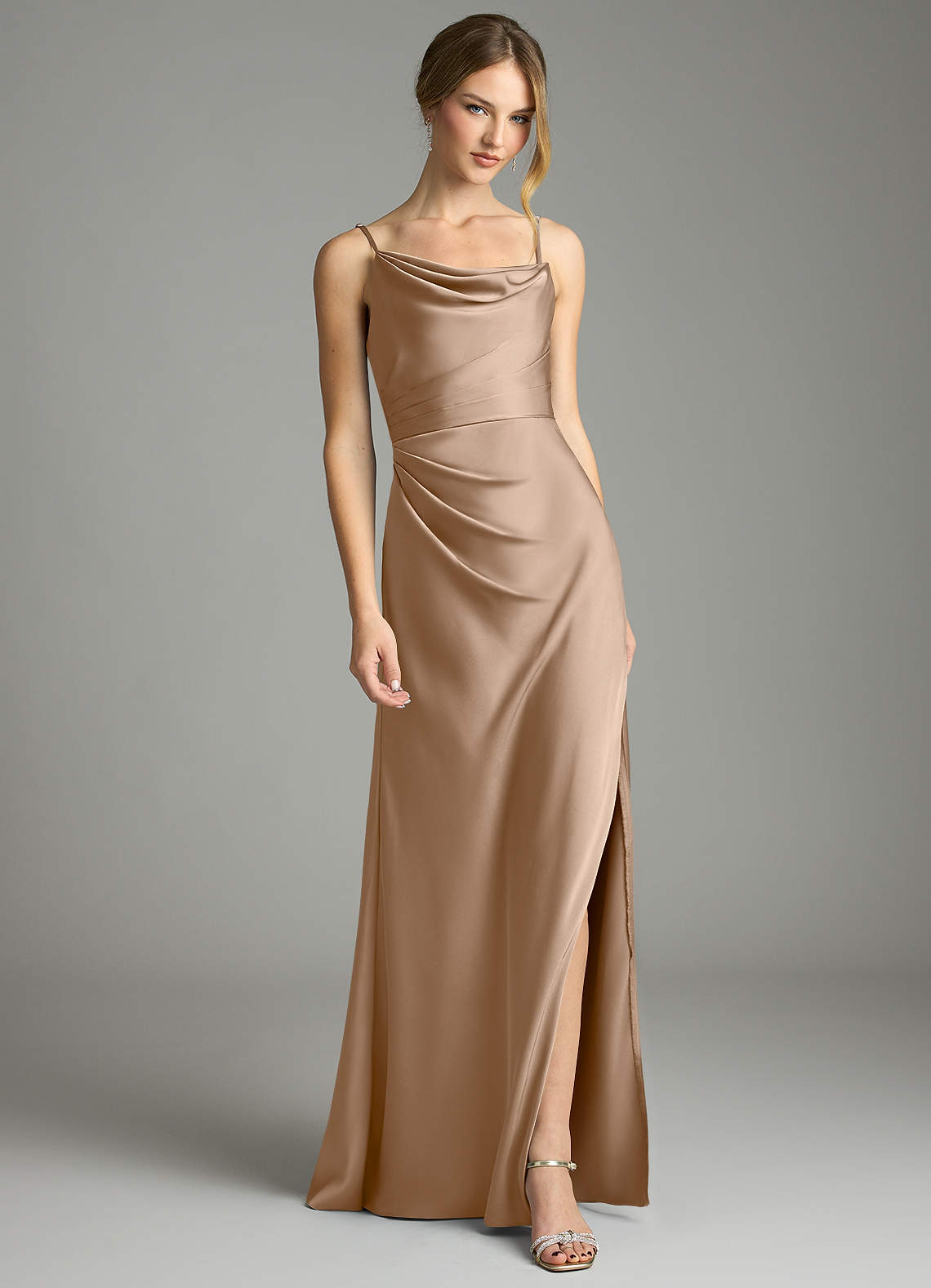 Vestido de Gris Pardo de Satén Elástico de Corte Recto con Plisado