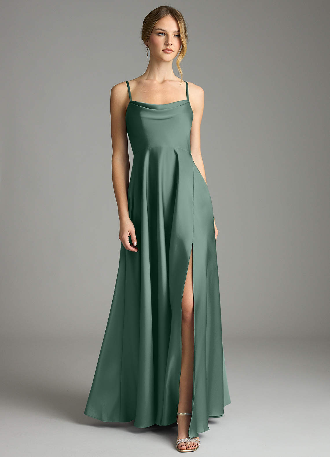 Vestido de Eucalipto de Satén Elástico de Corte en A con Plisado