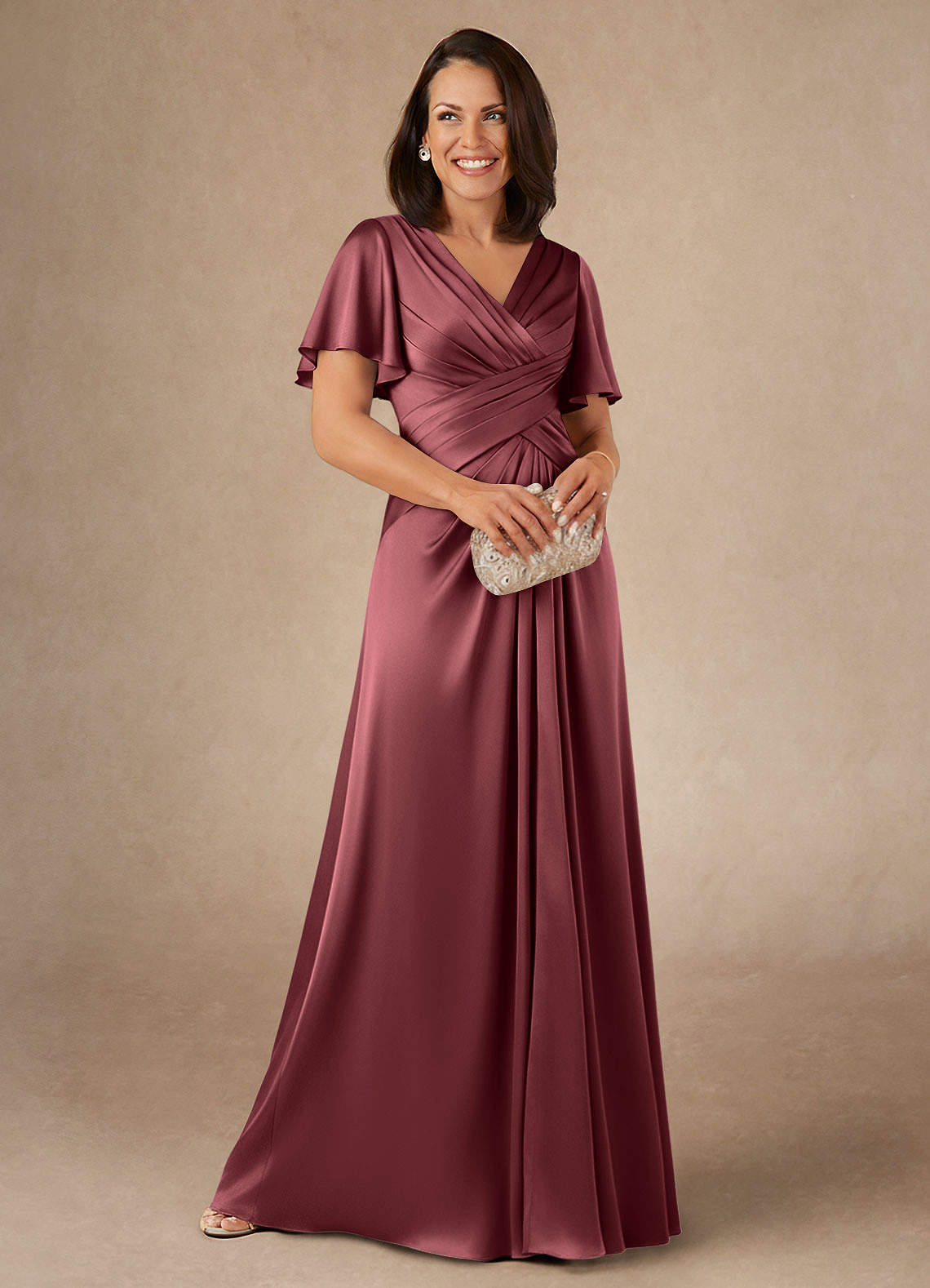 Vestido de Merlot de Satén Elástico de Corte en A con Plisado