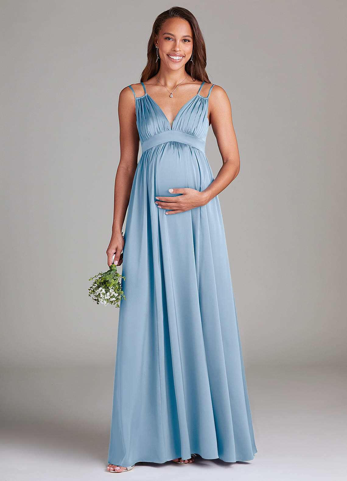 Vestido de Corte en A Con bolsillos Hasta el suelo Satén Elástico Azul pálido