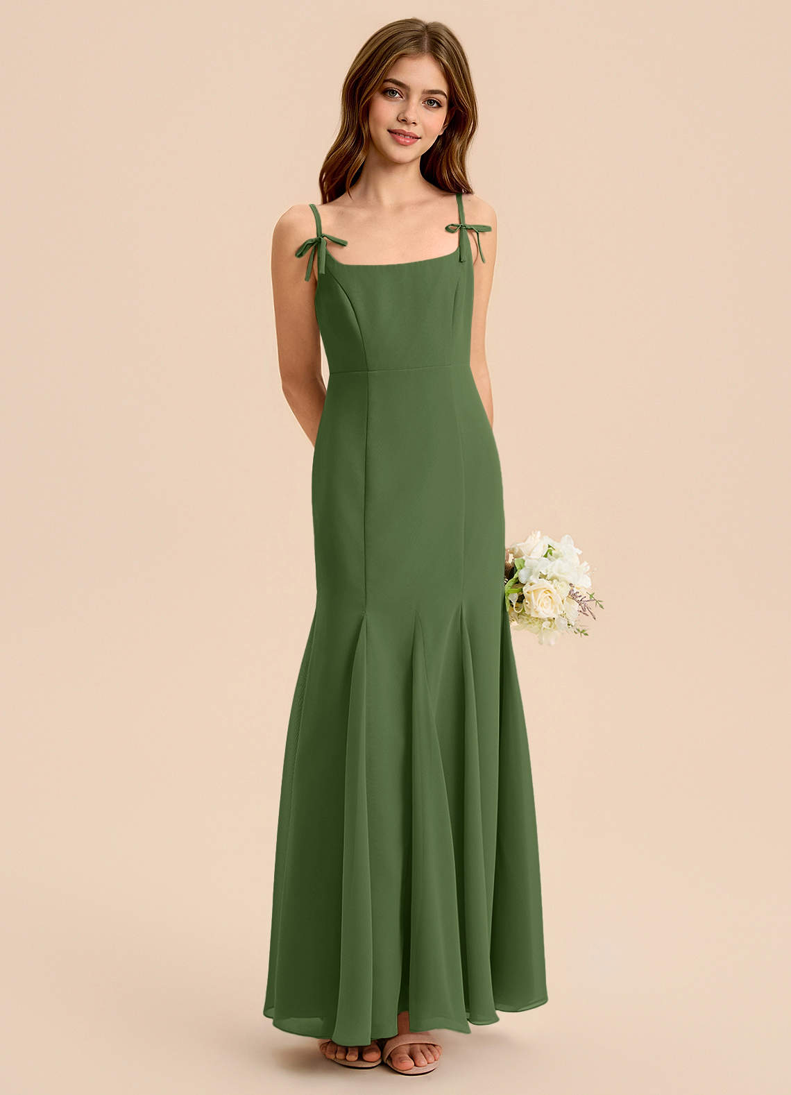 Vestido de Oliva de Gasa de Corte Sirena con Plisado