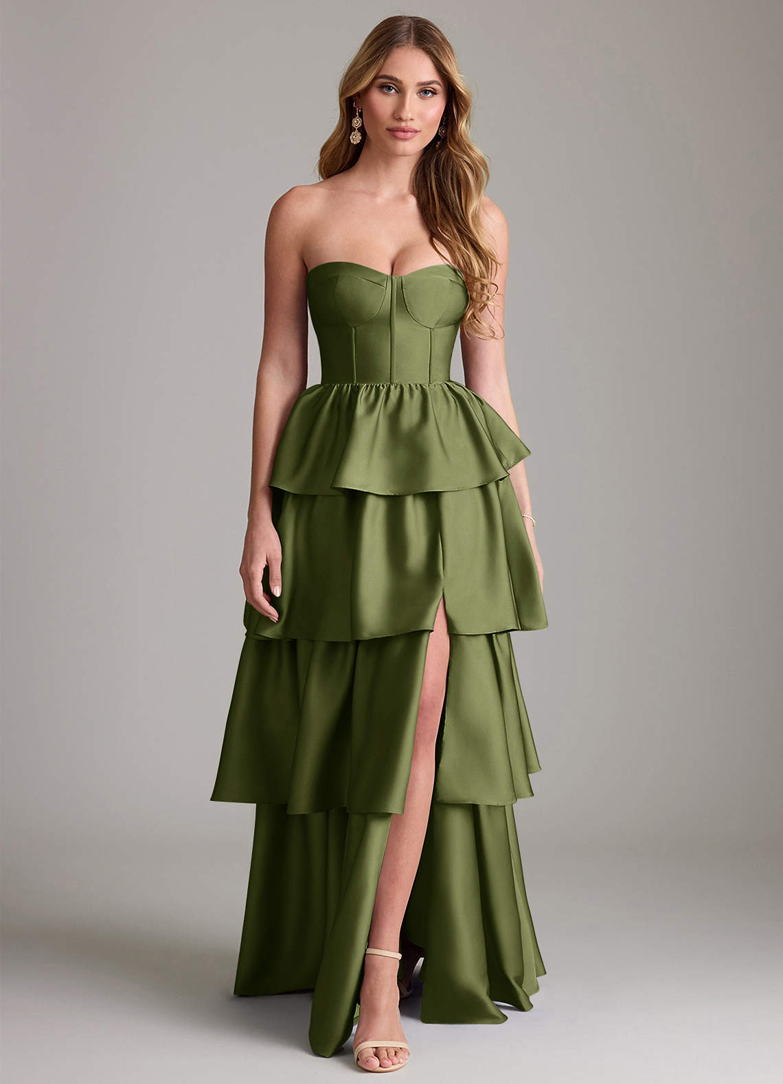 Vestido de Oliva de Satén Elástico de Corte en A con Volante